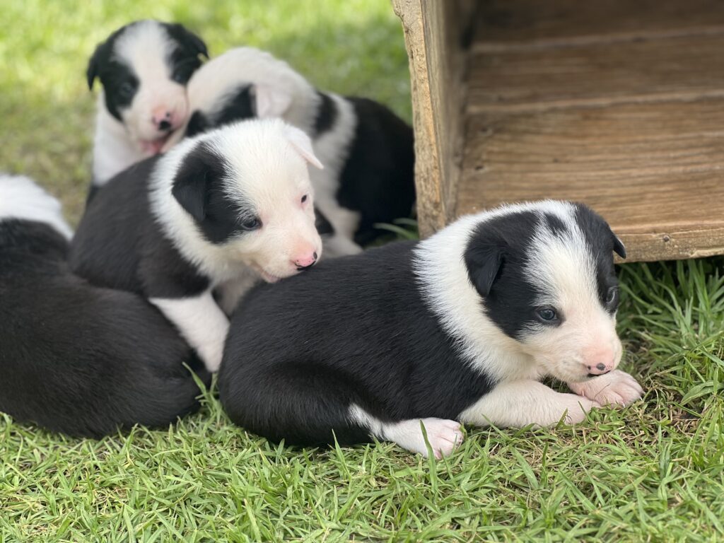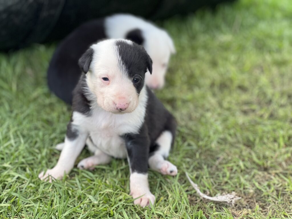 5 black and white pups 2 dogs and 3Females